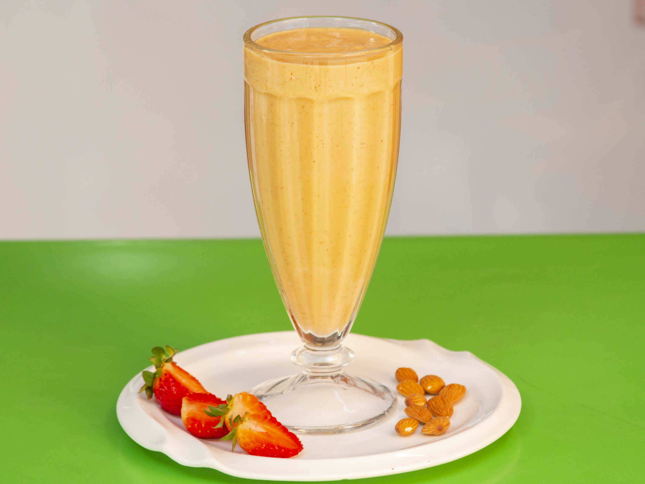 Licuado espeso de lúcuma, plátano, fresa, almendra y leche 12oz.
