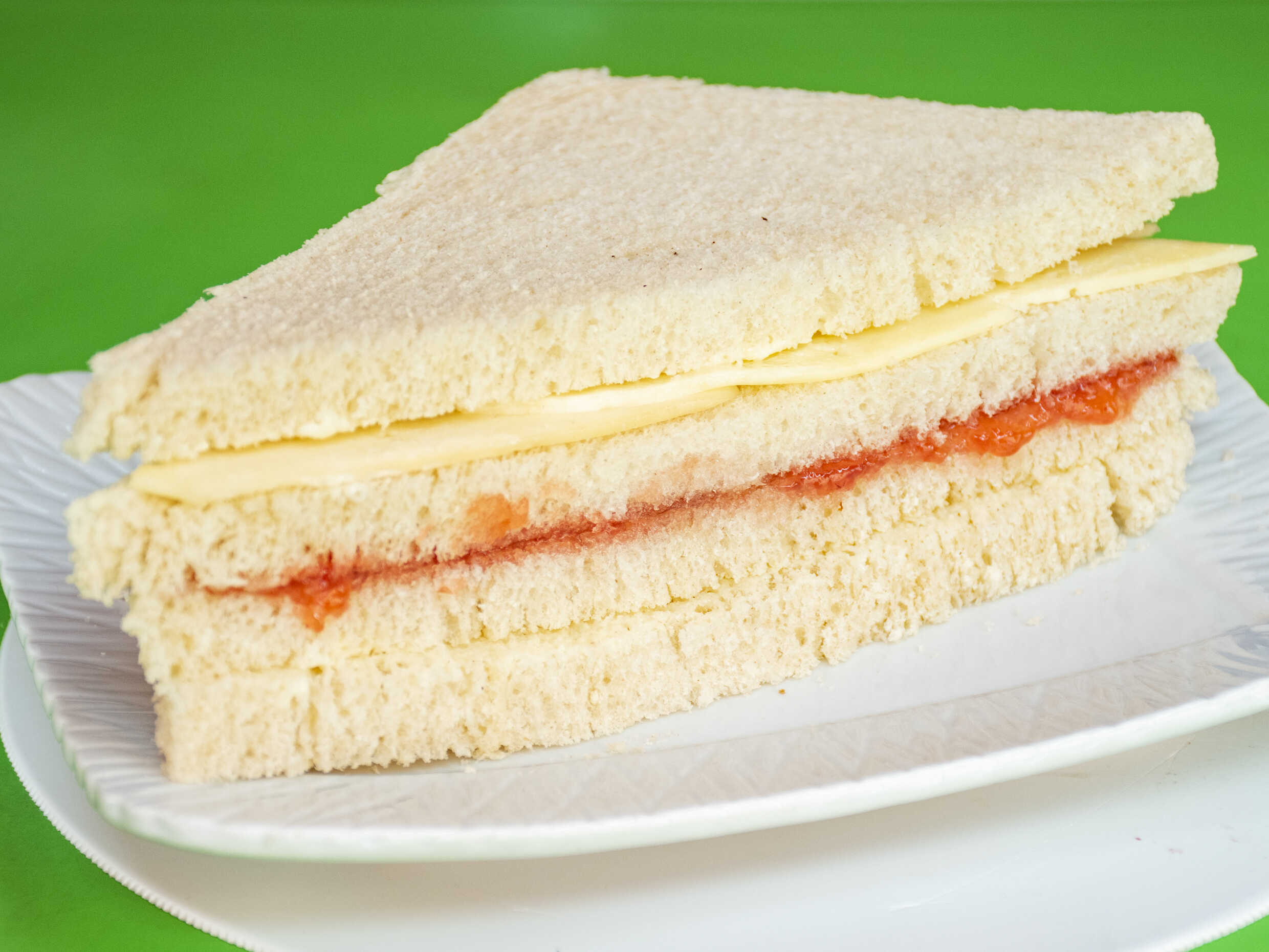 Pan molde con mermelada de fresa, mantequilla, y queso edam.