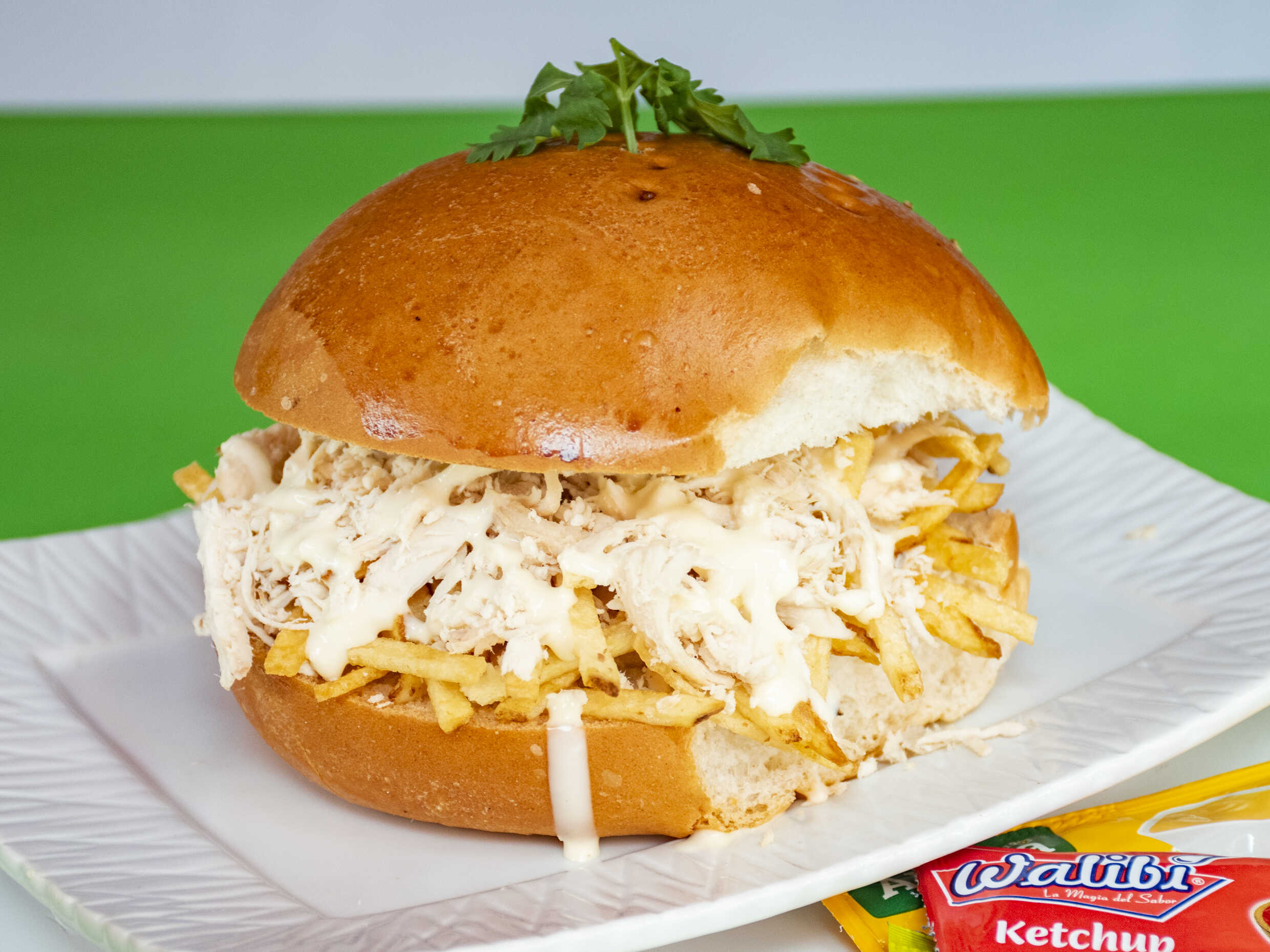 Tradicional pan con pollo, hecho de pan hamburguesa con pollo deshilachado y papas al hilo, cremas al gusto en el pan.