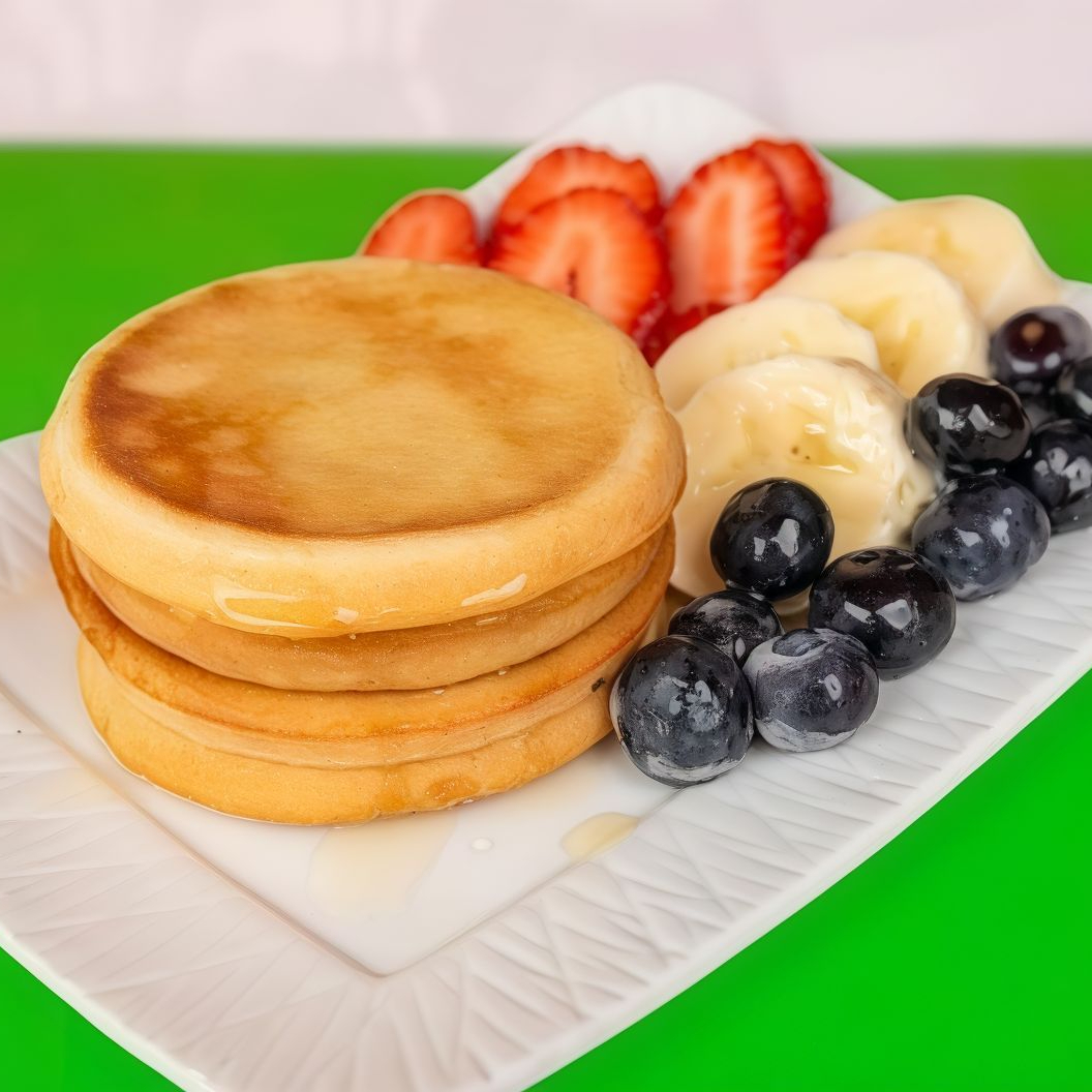 Cuatro Panqueques esponjosos hecho de harina de trigo, acompañado con frutos del bosques, platano, mango, kiwi y miel. Utilizando la receta casera y tradicional.