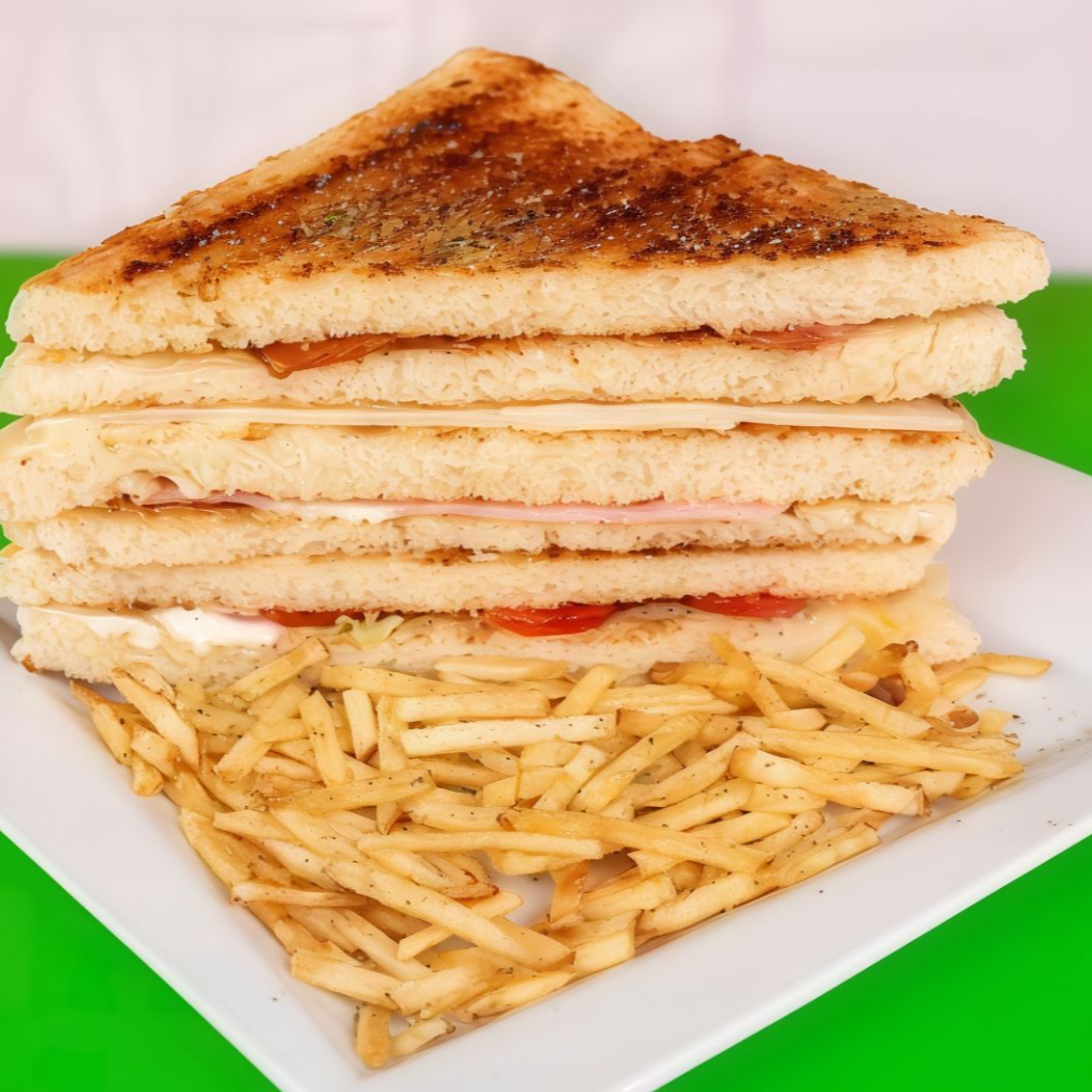 Pan molde tostado con mantequilla, lechuga, tomate, tocino ahumado, jamón ingles, queso edam, pollo deshilachado, mayonesa y acompañado de papas al hilo.