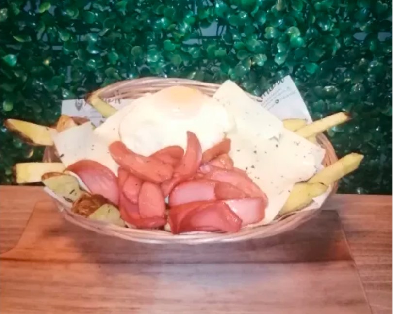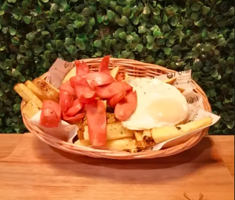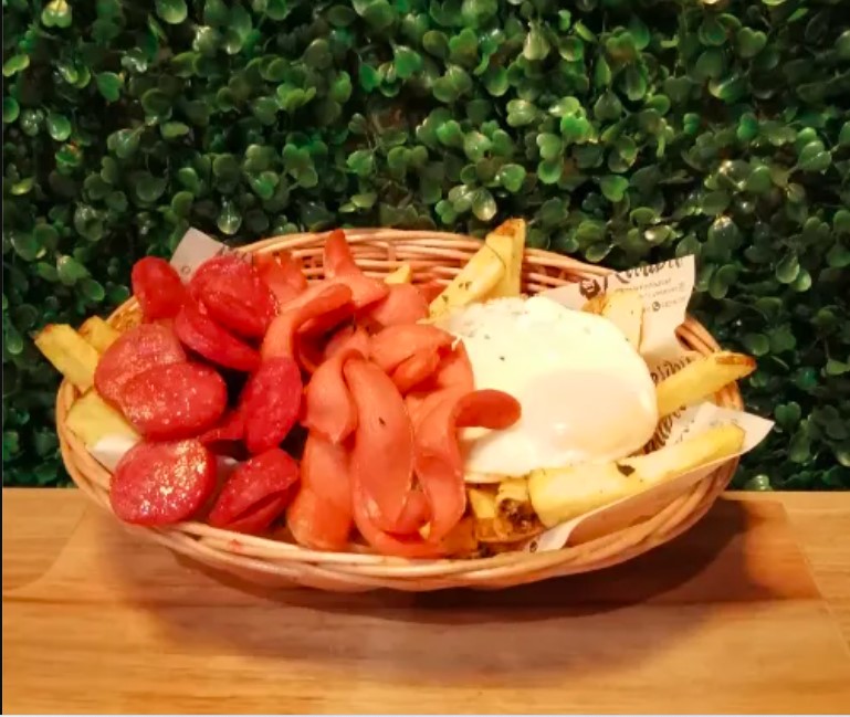 Deliciosas papas fritas con queso cheddar, tocino, chorizo parrillero, finas hierbas, salchicha frankfurt y huevo.