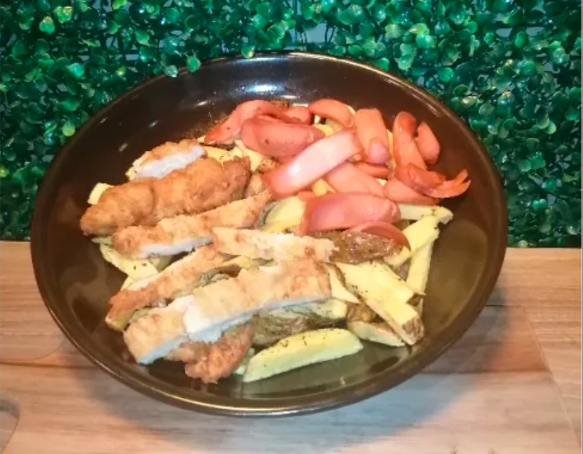Deliciosas papas fritas, filete de pollo, huevo, hot dog y chorizo.