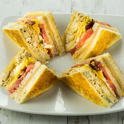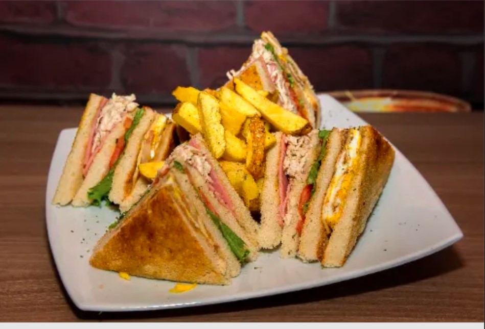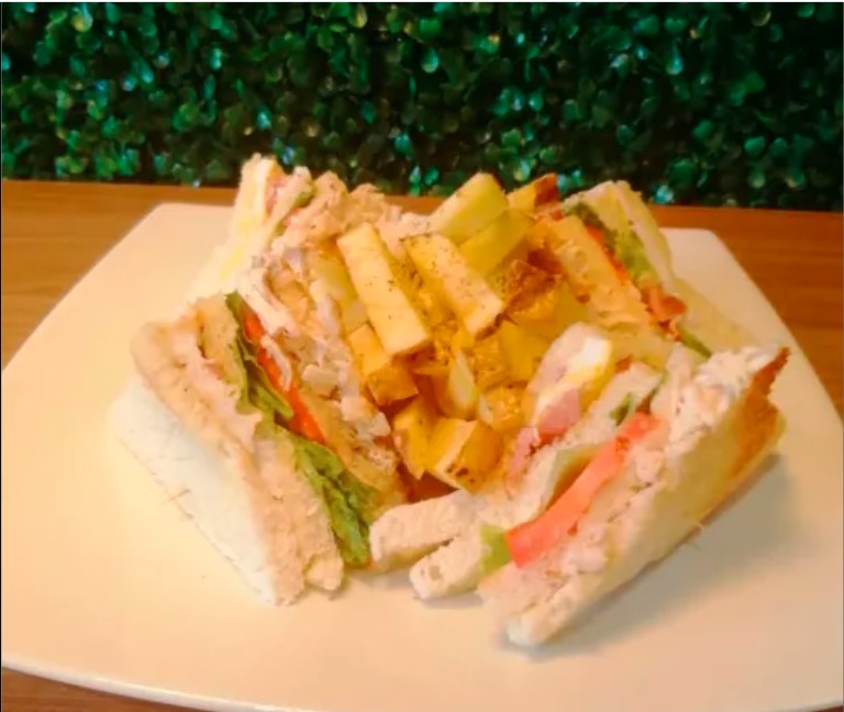 Pan de molde, pollo deshilachado, jamón, queso dambo, tocino, lechuga, tomate, acompañado con nuestras deliciosas papas fritas.