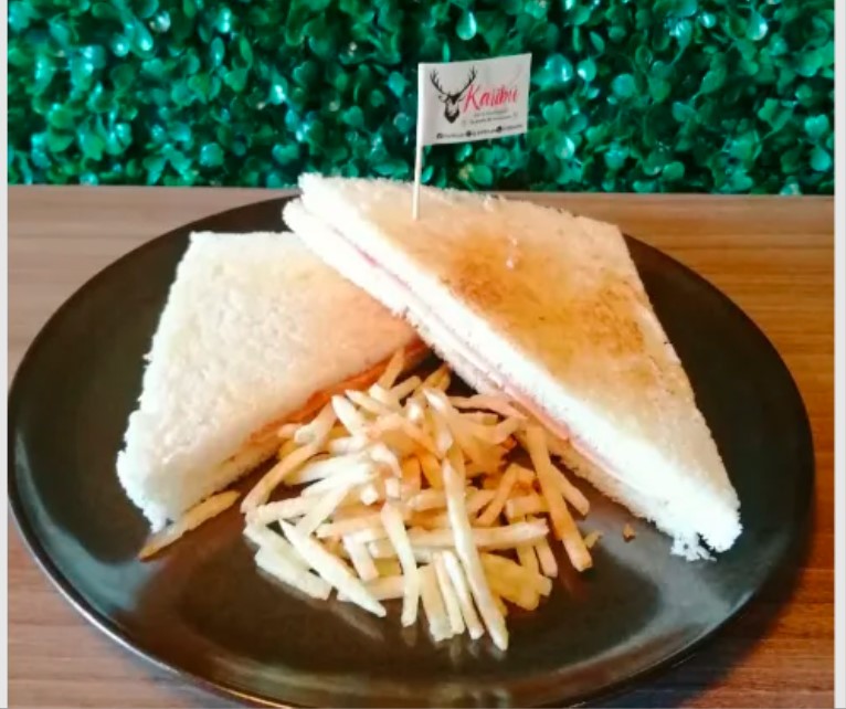 Pan de molde, jamón, queso dambo, acompañado con papas al hilo.