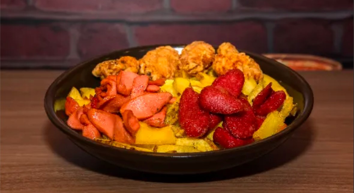 Deliciosas papas fritas, 4 alitas (salsa a elección), hot dog y chorizo.