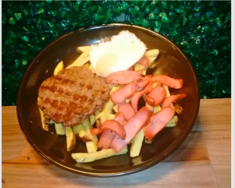 Pan artesanal tipo brioche, 110 g de nuestra jugosa carne de res, huevo, plátano, lechuga, tomate, acompañado con nuestras deliciosas papas fritas.