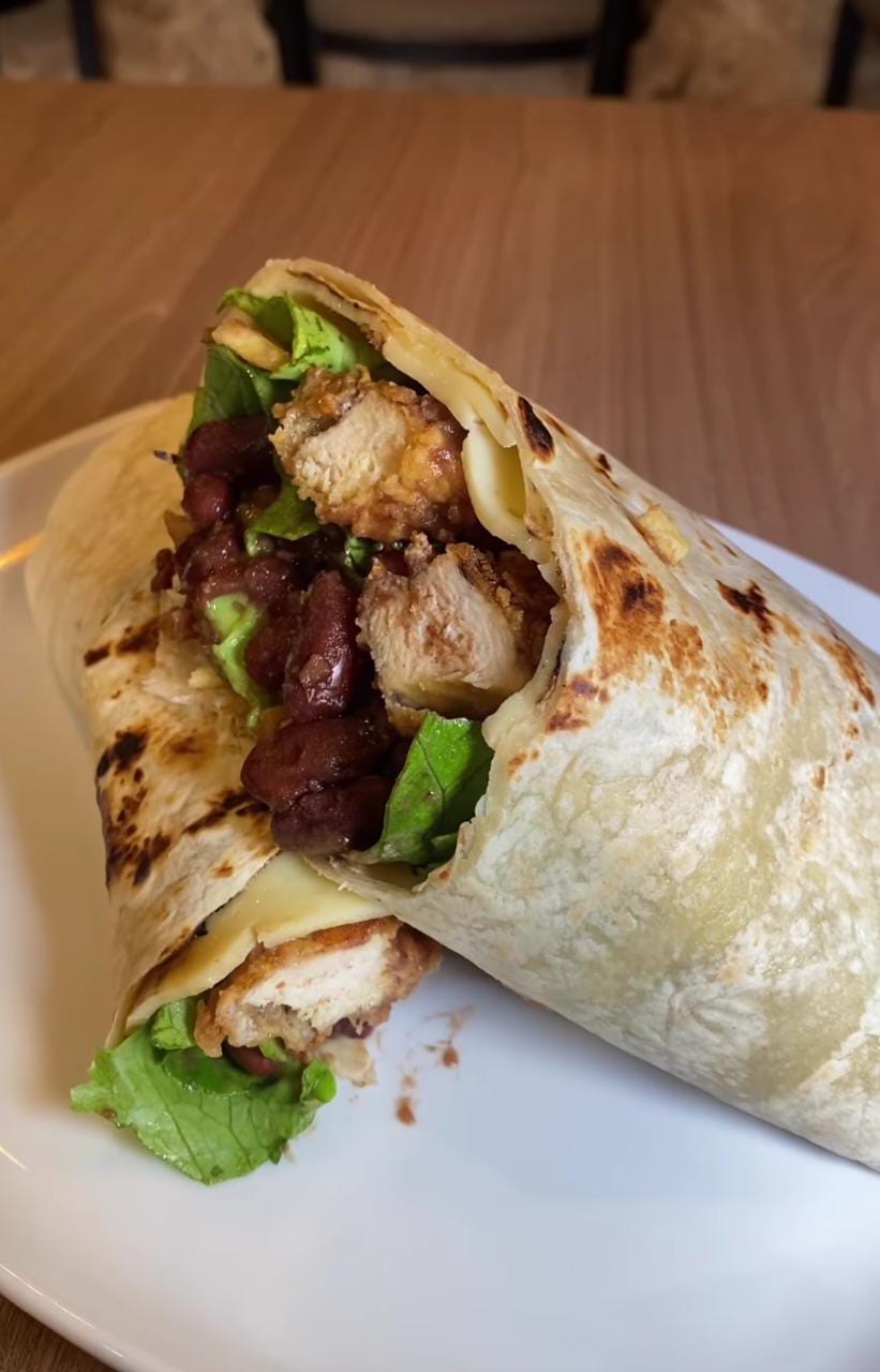 Tortilla, filete crispy, queso dambo, frejol, papas al hilo, palta y lechuga.