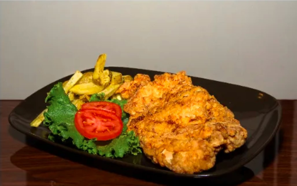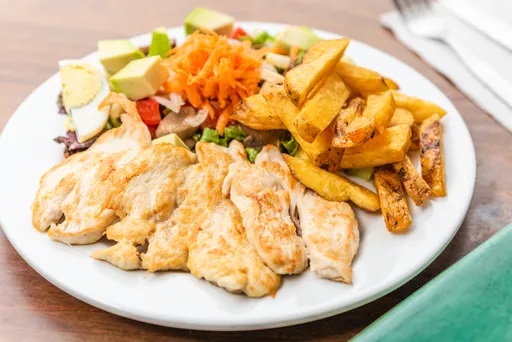 Filete de pollo, deliciosas papas fritas y ensalada fresca.