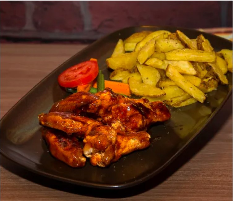 Alitas bañadas en salsa BBQ hot de la casa, acompañado con nuestras deliciosas papas fritas.