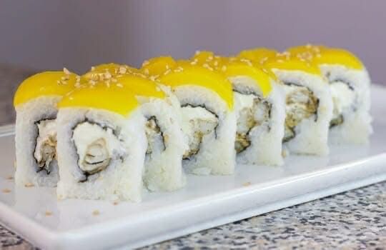 12 piezas de Maki de Queso crema y pescado furai cubierto de durazno y salsa de maracuyá.