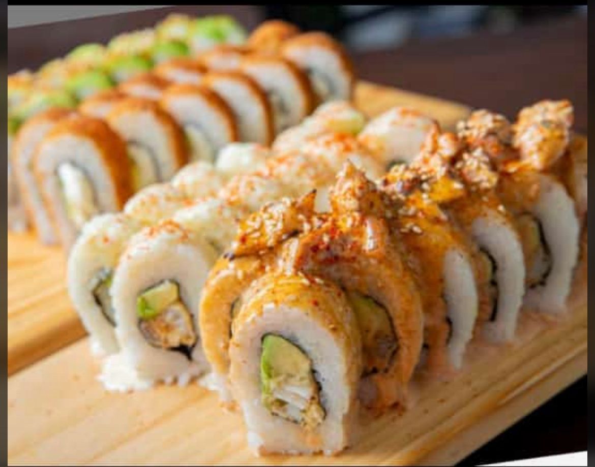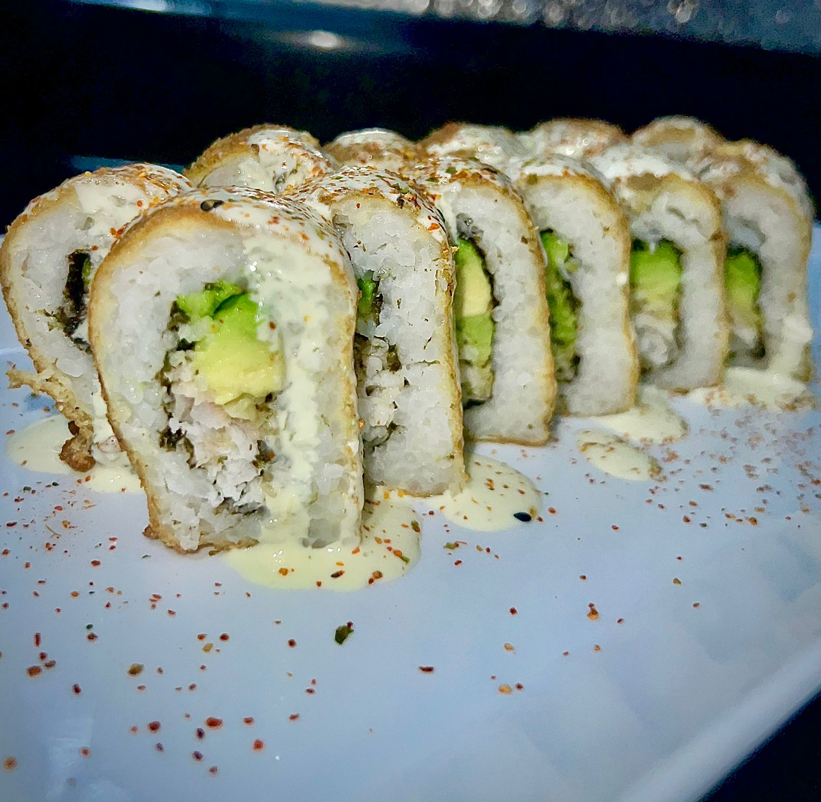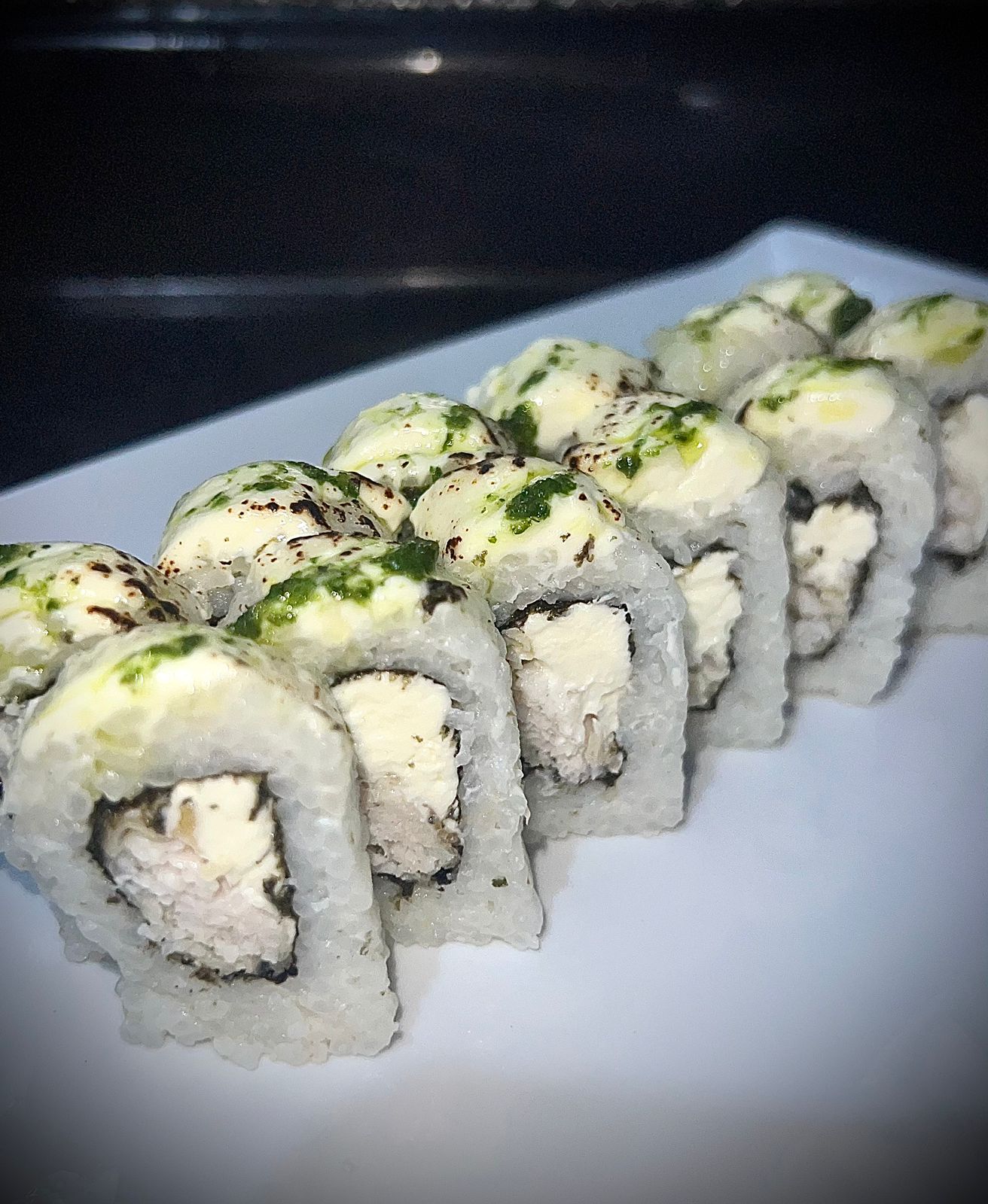 12 piezas de maki de Queso crema y pescado furai cubierto con salsa guacamole.