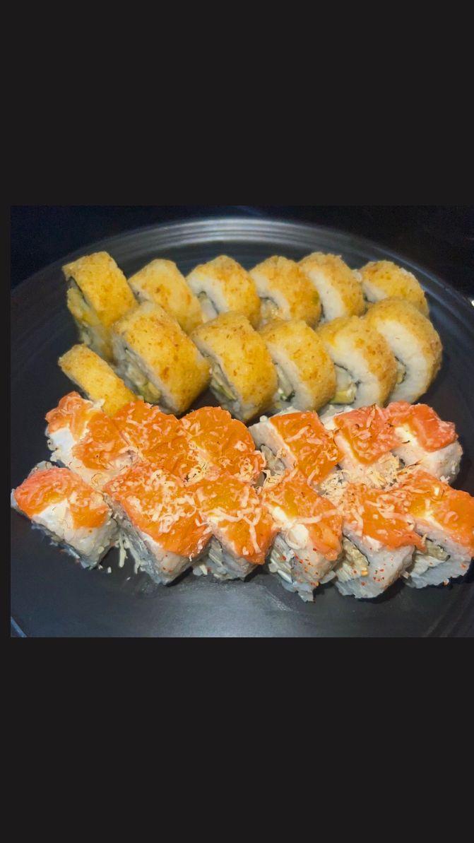 12 piezas de maki de Queso crema y pescado furai cubierto con trucha salmoneada y queso parmesano sopleteado.