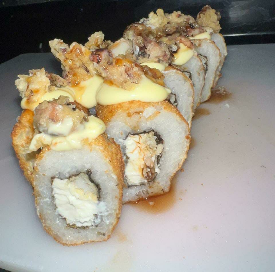 12 piezas de maki de Queso crema y pescado furai montado con chicharron de pulpo.