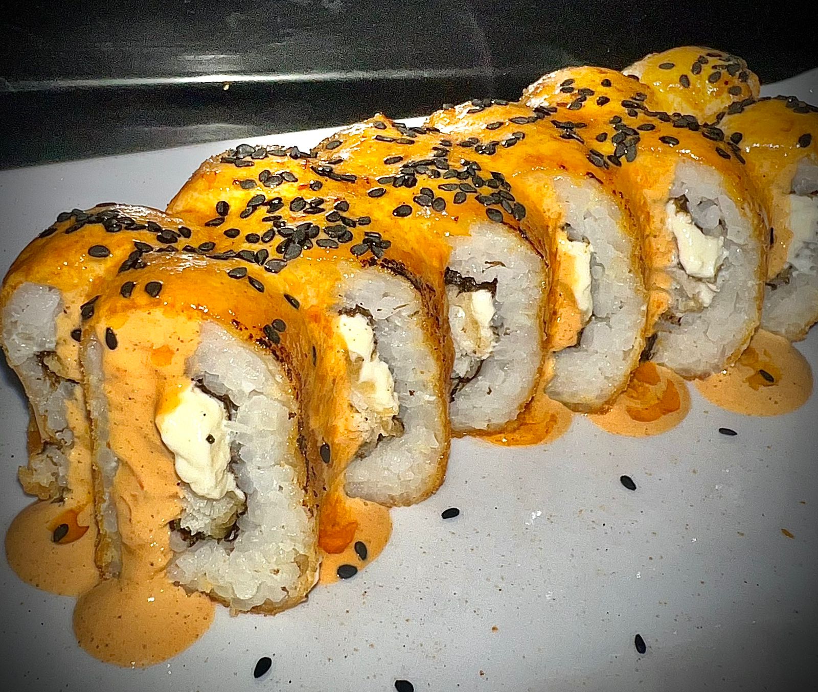 12 piezas de maki de Queso crema y pescado furai cubierto con wantan y salsa dulce.