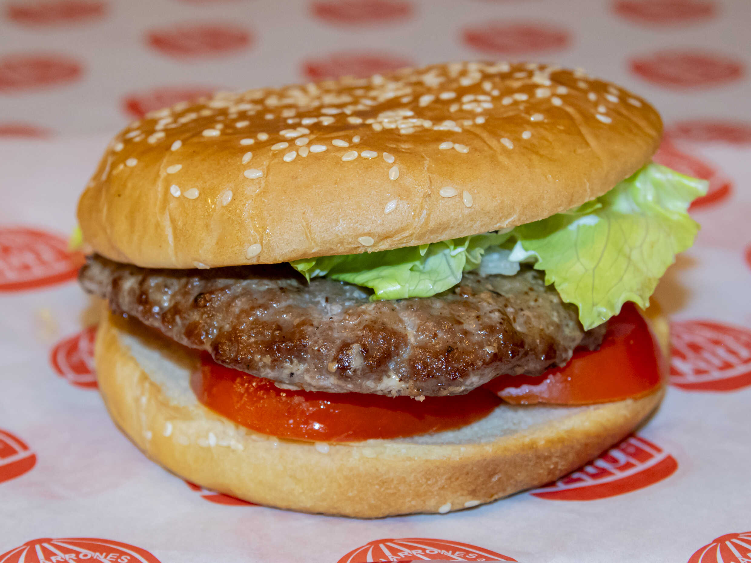 Sándwich con hamburguesa de la casa, acompañado con tomate, lechuga y mayonesa.