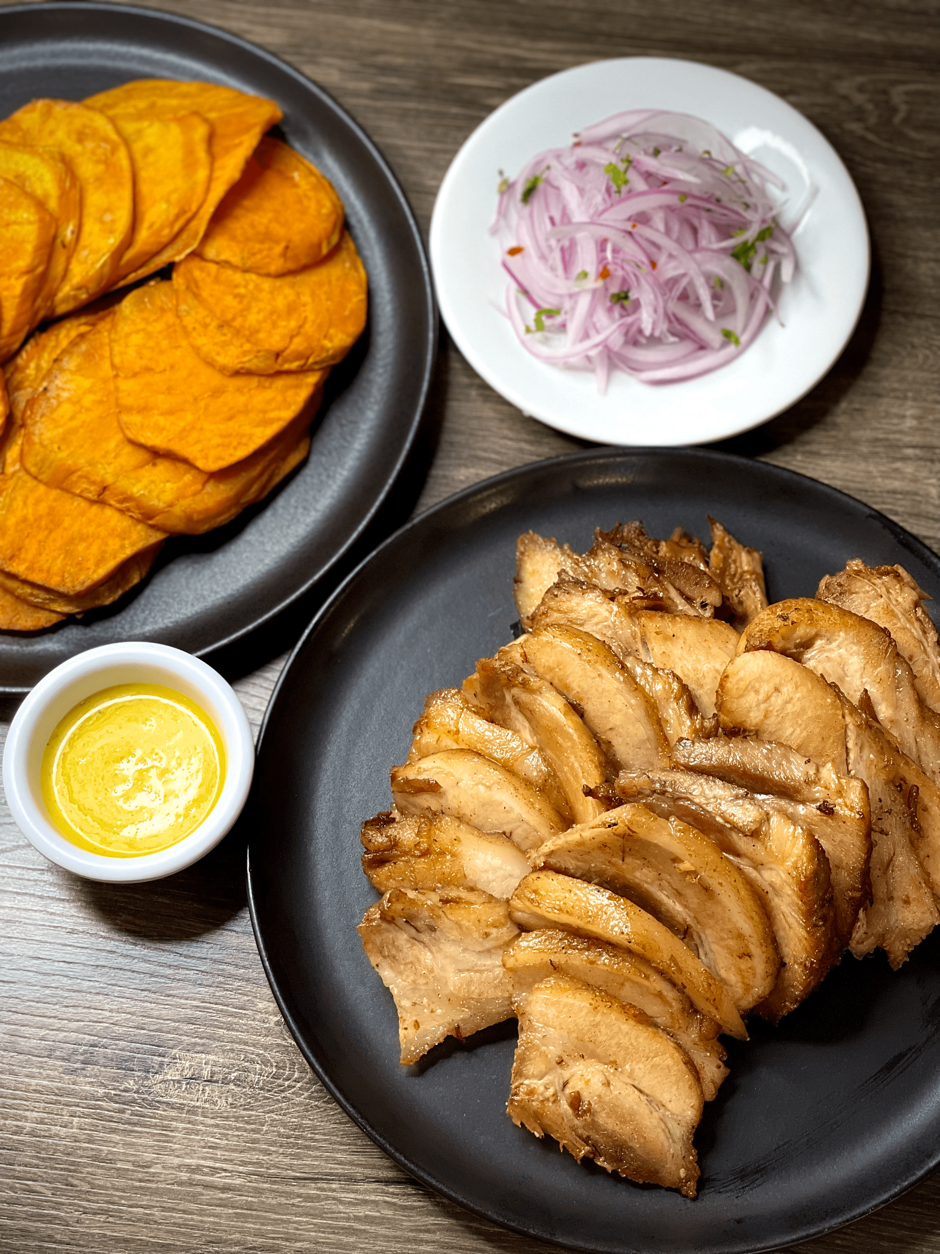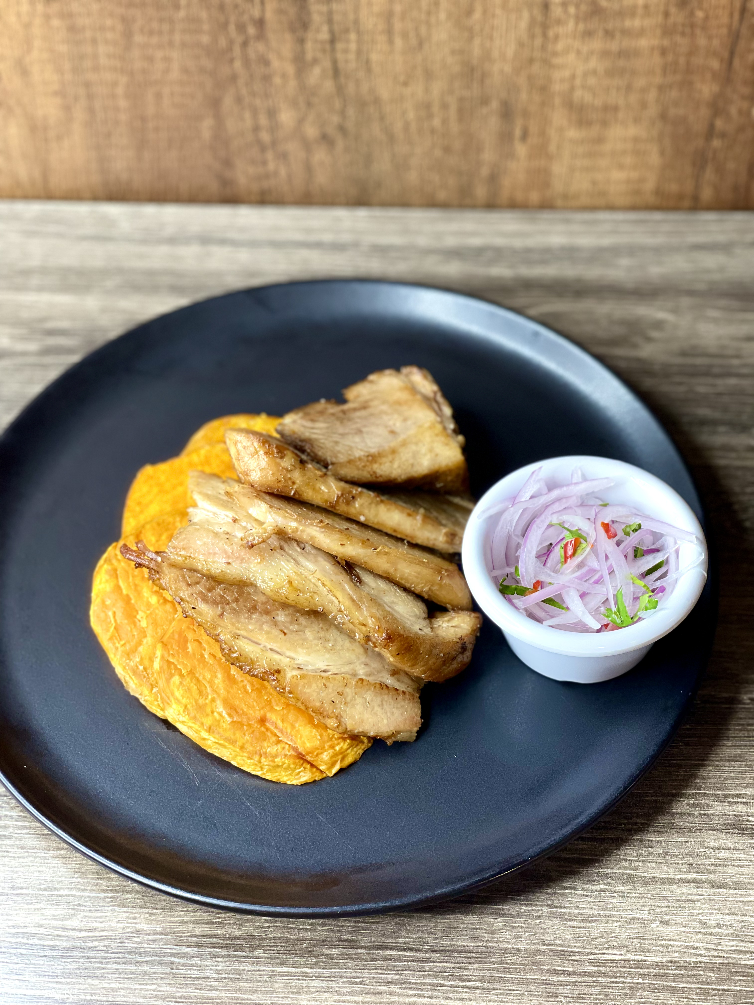 Costillitas con aderezo especial de la casa y porción de camote.