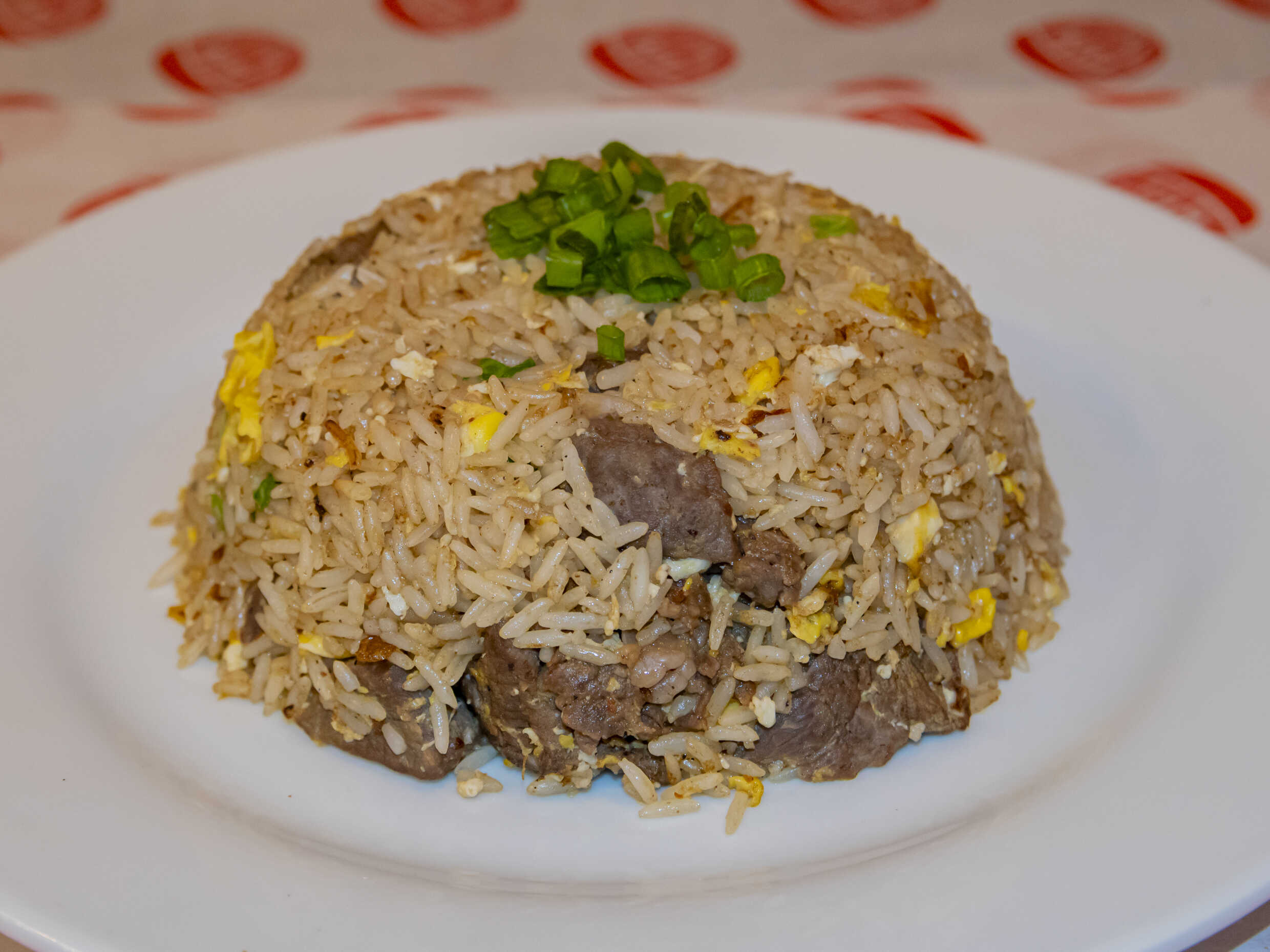 Arroz chaufa salteado con carne, huevo frito y cebolla china.