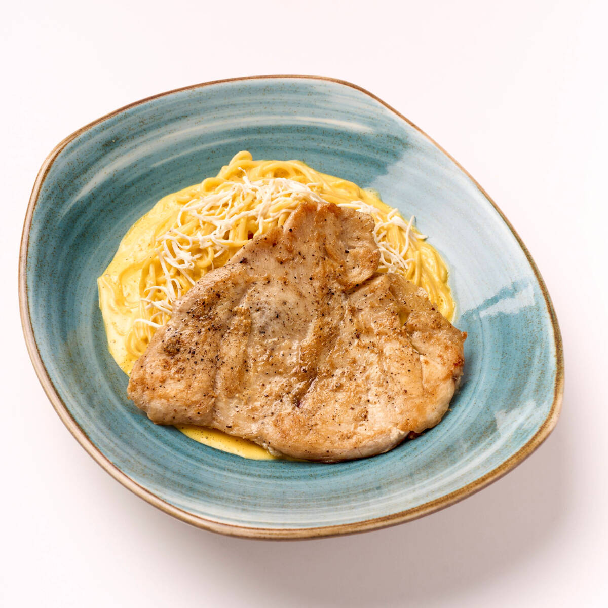 Tallarín a la criolla salteado, trozos de pollo con cebollas, tomates y ajíes.
