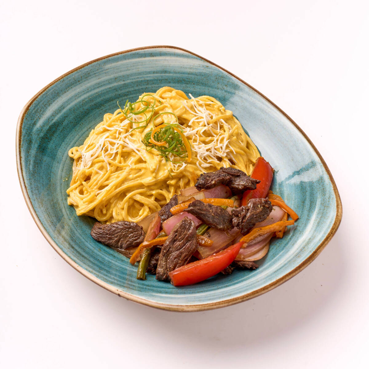 Tallarín a la criolla salteado con trozos de carne, cebollas, tomates y ajíes.