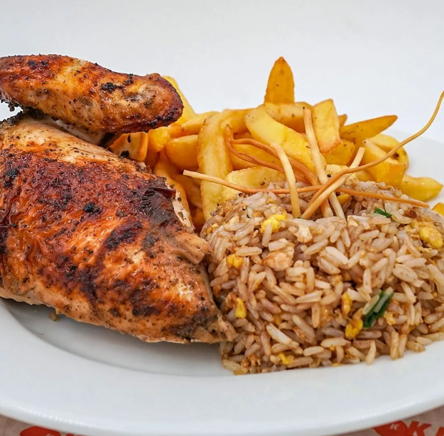 Trozos de pollo flameados al wok con cebolla, ají amarillo, acompañado con papas fritas y arroz.