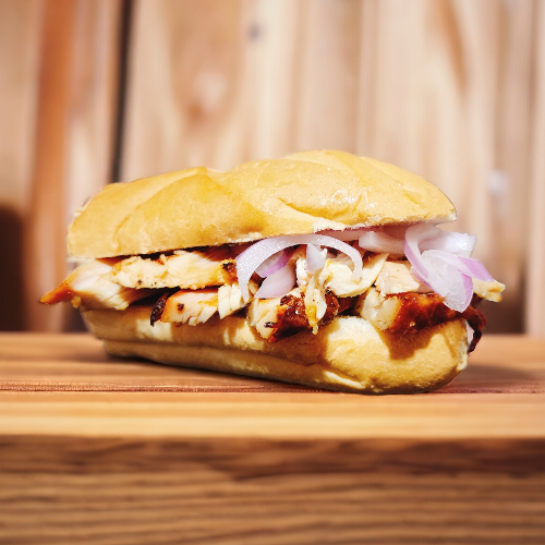 Gallina horneada con leña a fuego lento, acompañado de sarsa criolla en pan ciabatta.