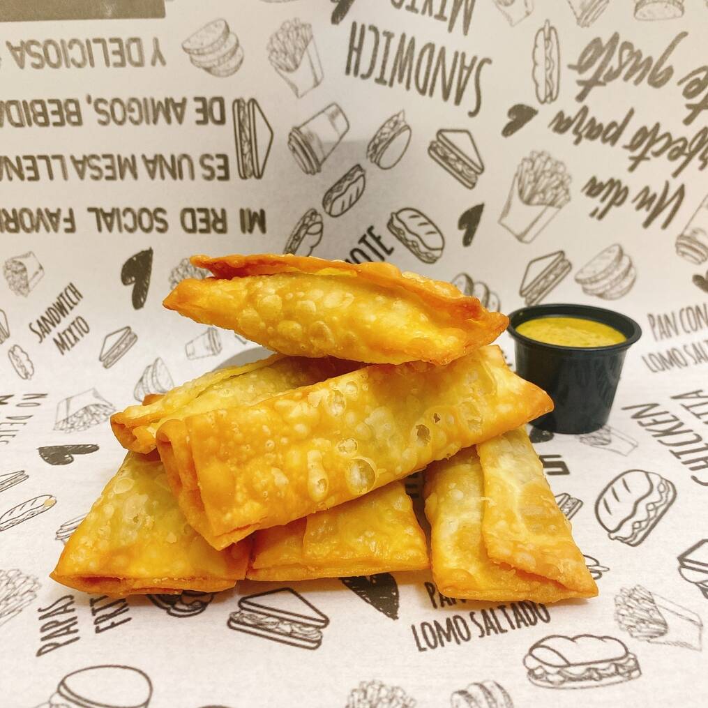 6 Tequeños rellenos de jamón, queso mozzarella, orégano, acompañados de salsa casera