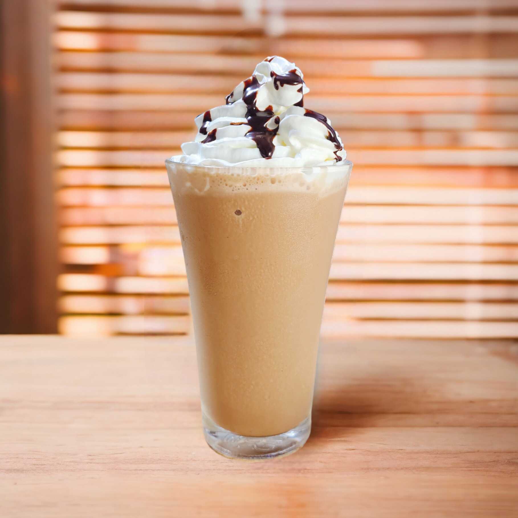 Frappuccino con salsa de chocolate mezclado con leche y hielo, decorado con crema chantilly.