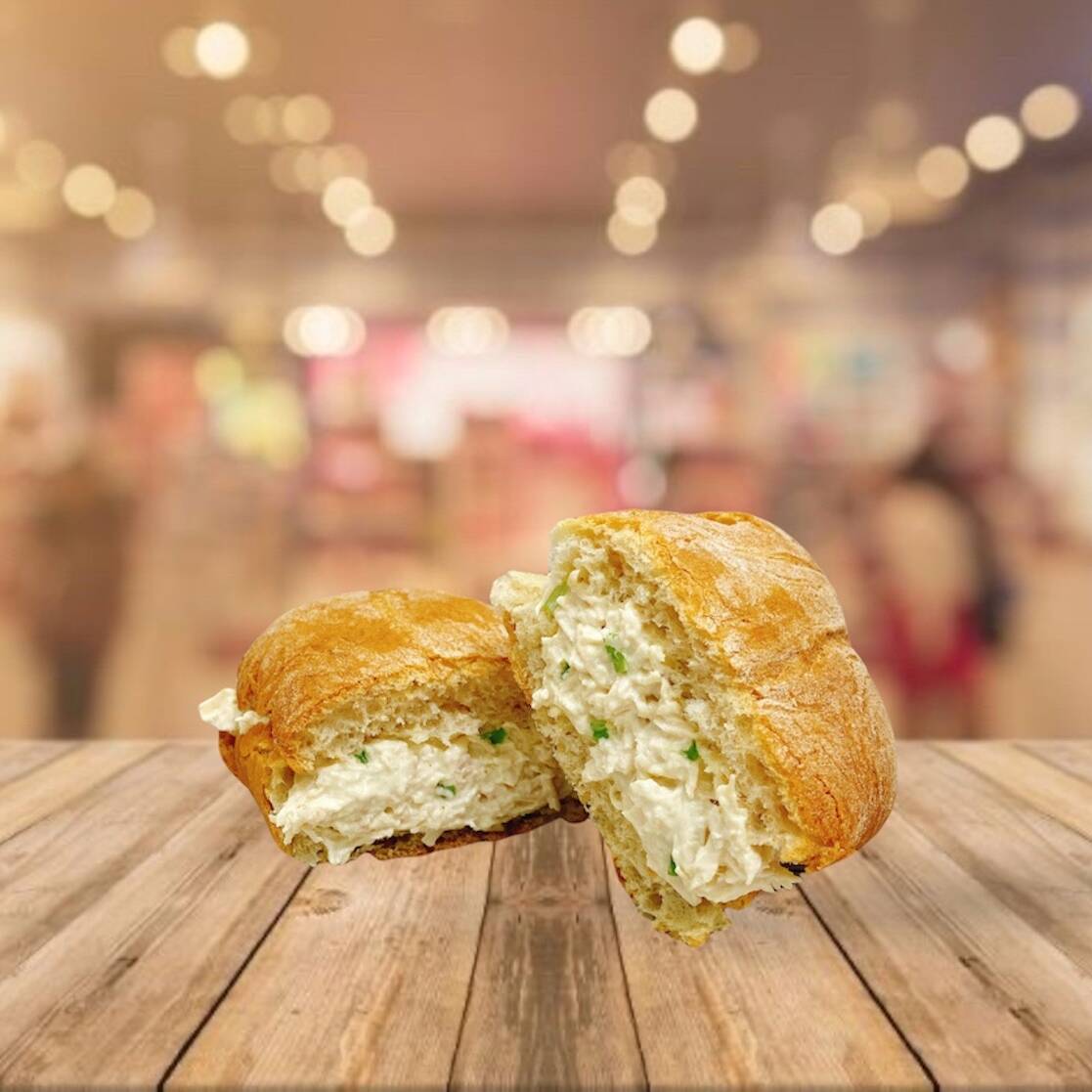 Sándwich de pollo deshilachado, apio y mayonesa.