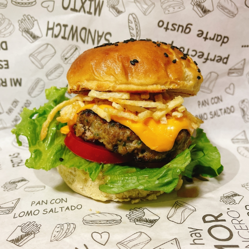 Hamburguesa artesanal 150g en pan brioche, queso cheddar, lechuga, tomate, papas al hilo y mayonesa.