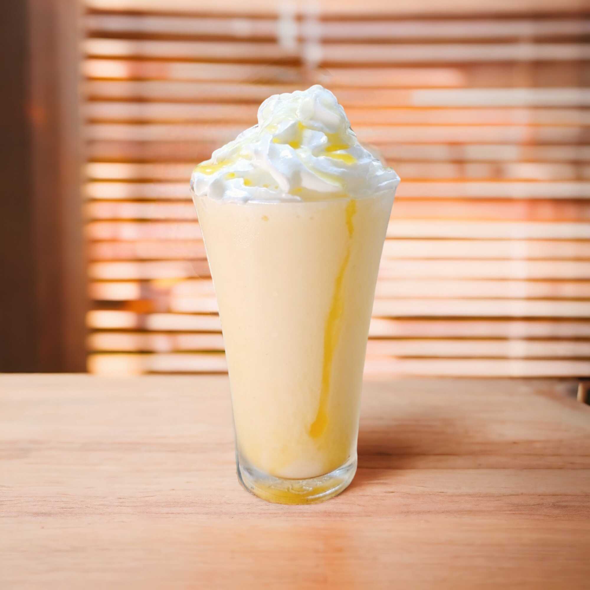 Frappuccino con salsa de maracuyá mezclado con leche y hielo, decorado con crema chantilly.