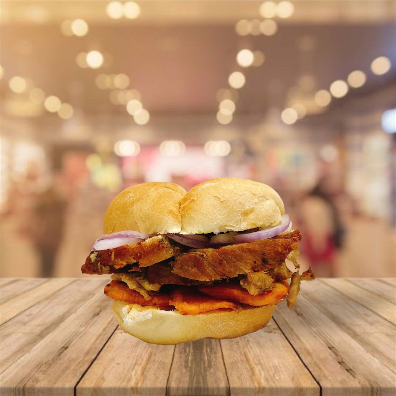 Sánguche de lechón horneado con leña a fuego lento, acompañado de sarsa criolla y mayonesa.