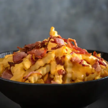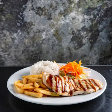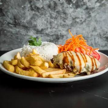 Filete en salsa bbq, queso, papas fritas, arroz, ensalada