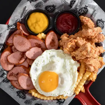 Frankfurt municipal, papas fritas, crispy pop, huevo frito.
