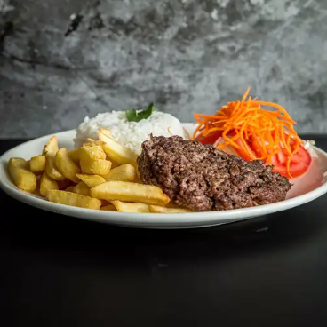 Hamburguesa angus a la plancha, papas fritas, arroz, ensalada