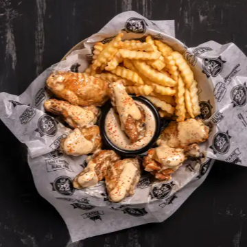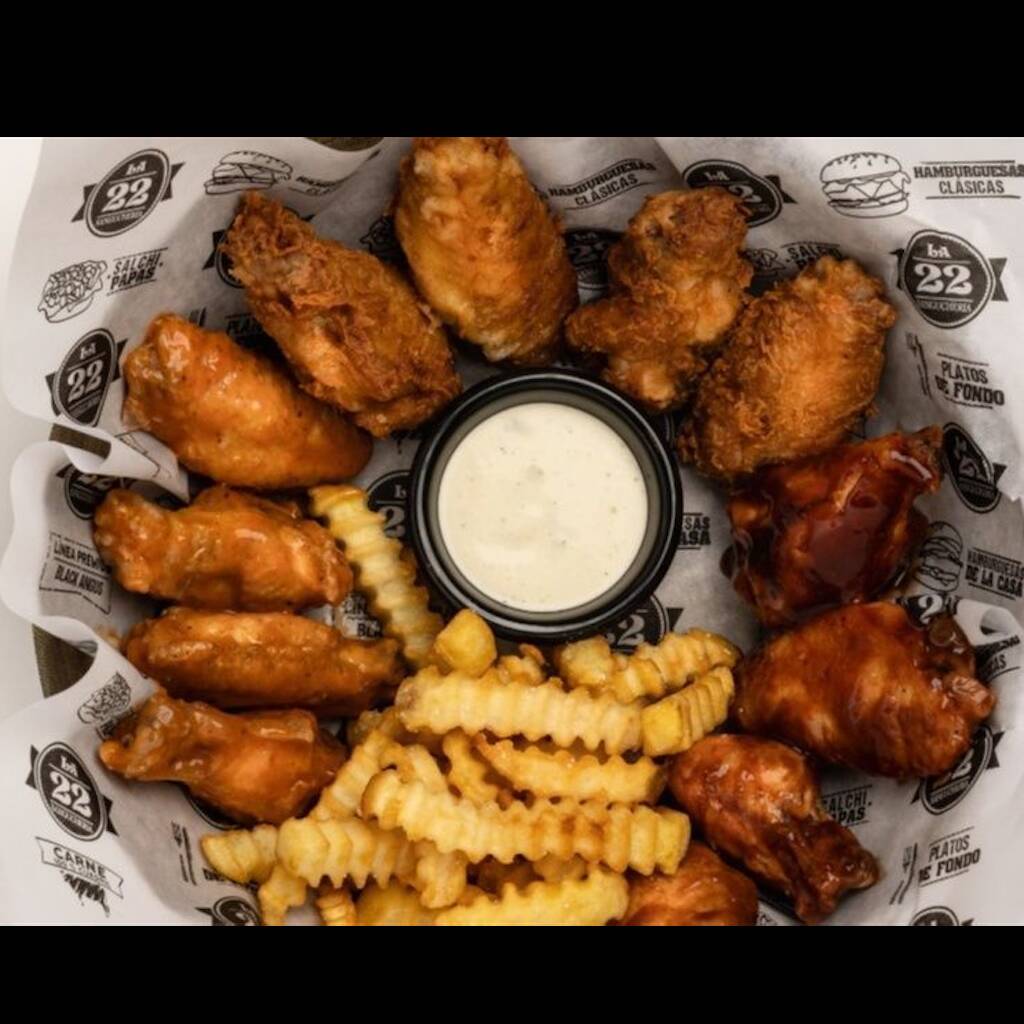 12 alitas (2 elecciones), papas fritas, salsa dip