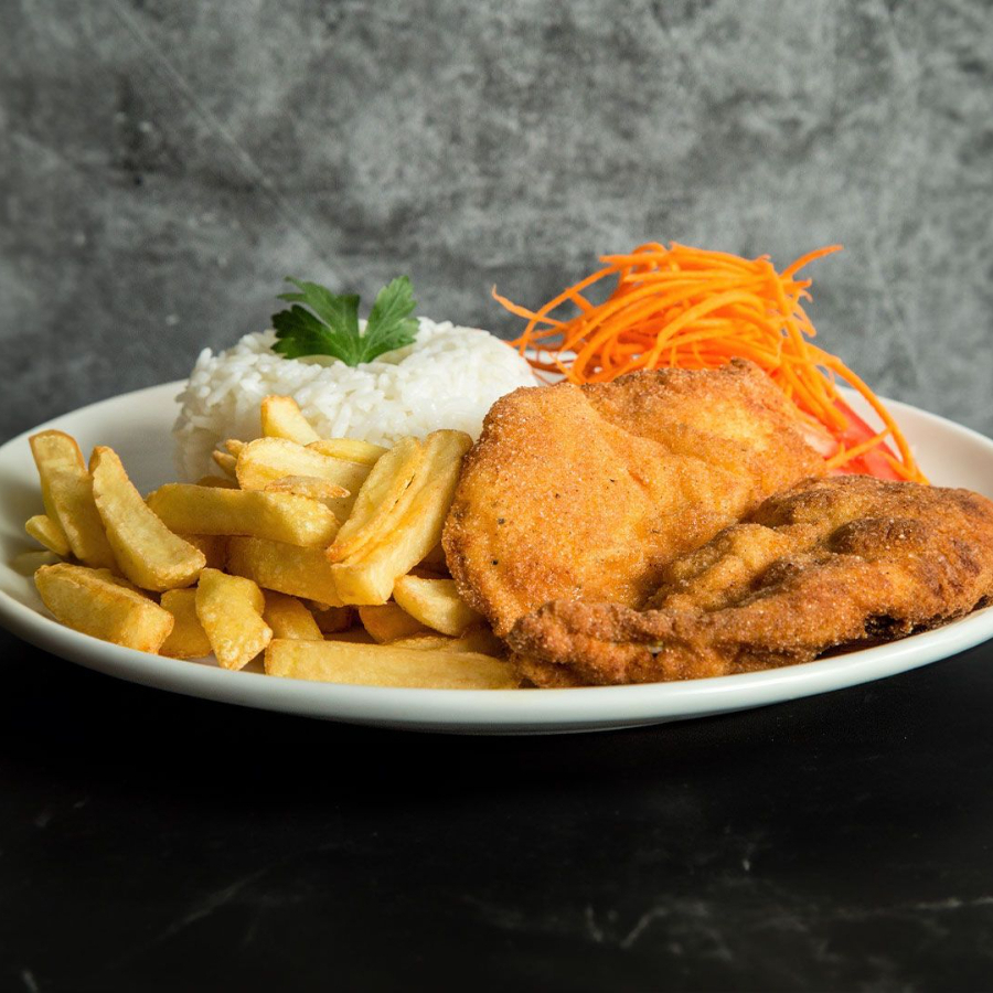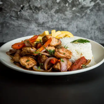 Dados de pechuga, vegetales salteados, papas fritas y arroz