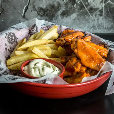 6 alitas en salsa buffalo, papas fritas, salsa dip