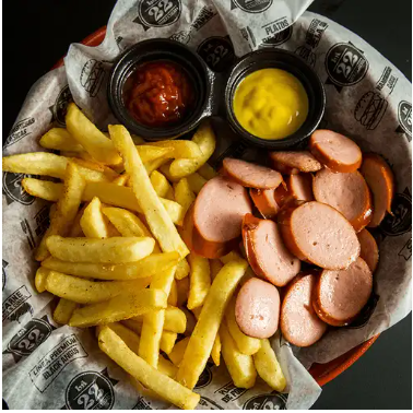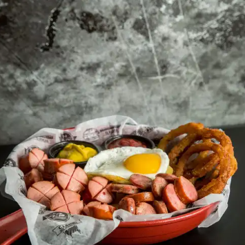 160 gr Frankfurt municipal, papas fritas, chorizo parrillero y chorizo finas hierbas, huevo, onion rings.