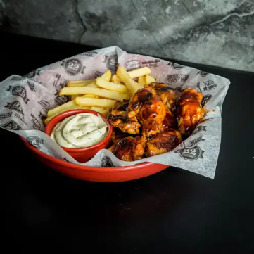 6 alitas en salsa BBQ, papas fritas, salsa dip