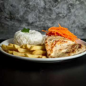Filete a la plancha (140g), papas fritas, arroz, ensalada