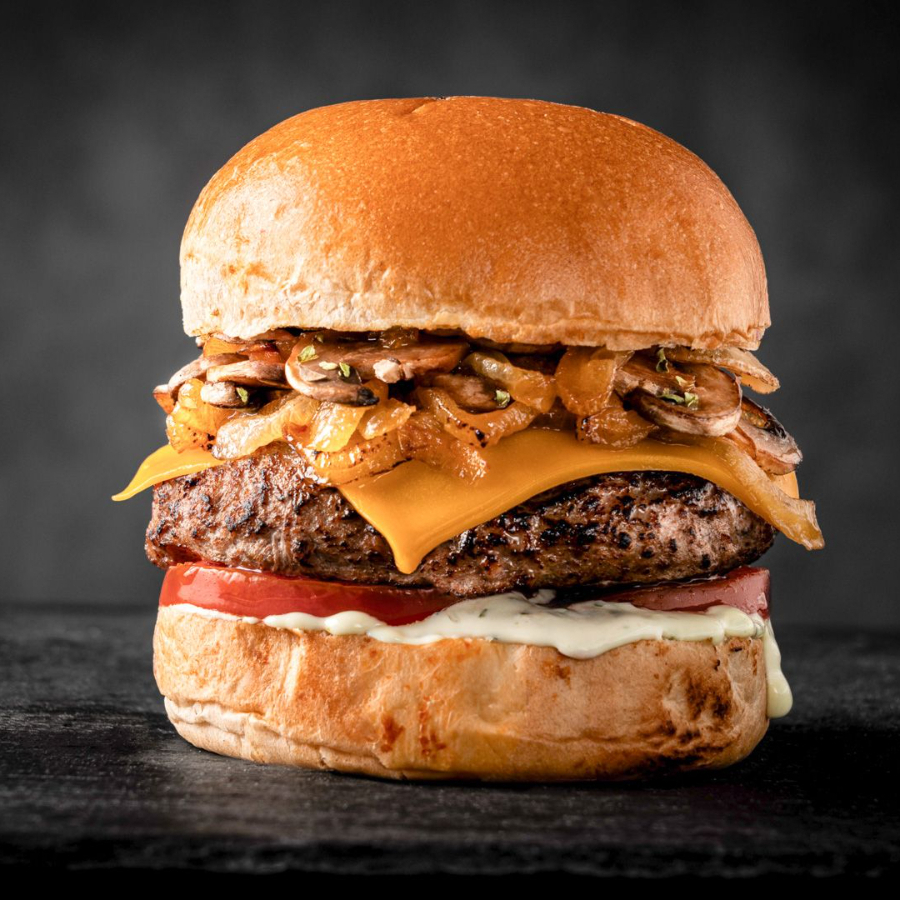 Pan brioche, carne angus 170g, cheddar doble, cebolla caramelizada, champiñon, tomate y mayo22.