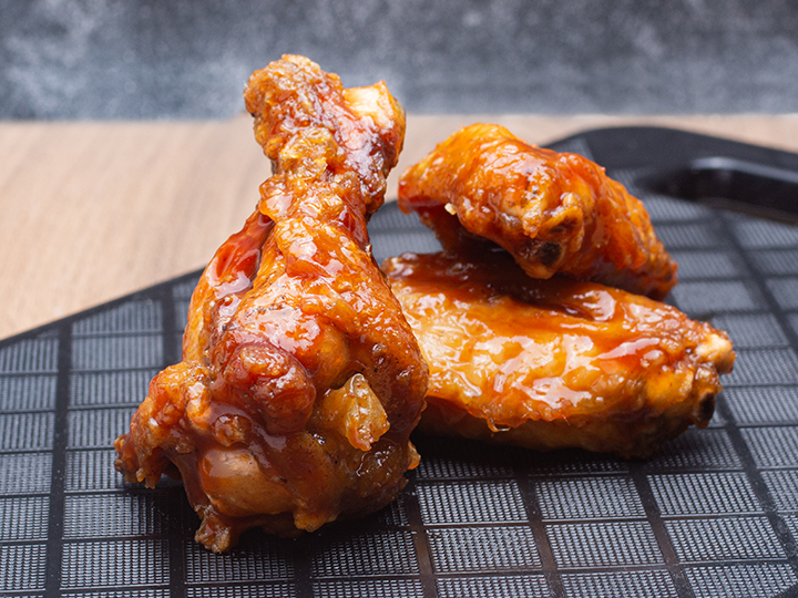 6 Deliciosas alitas fritas, bañadas en nuestra jugosa salsa BBQ.