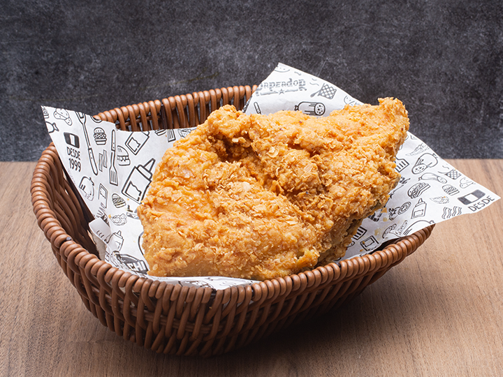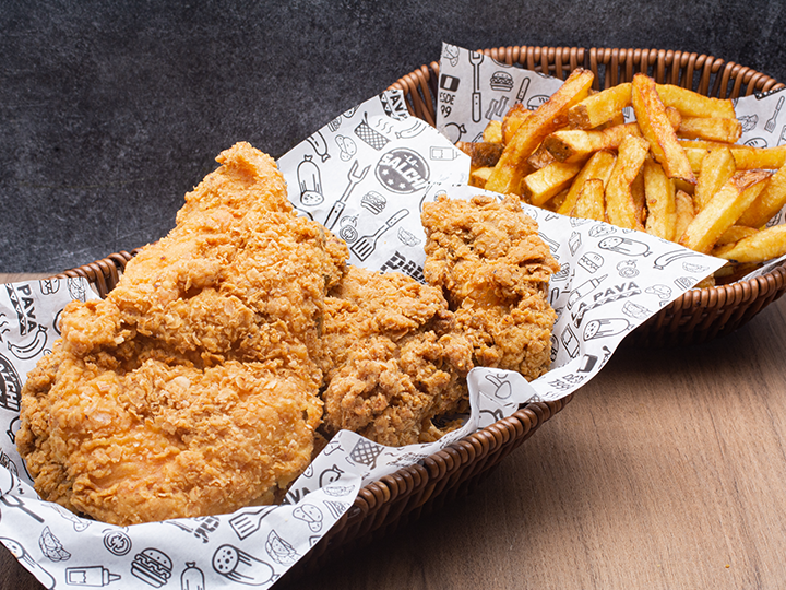 Trozos de pechuga de pollo broasters, acompañadas de nuestras deliciosas papas peruanas.