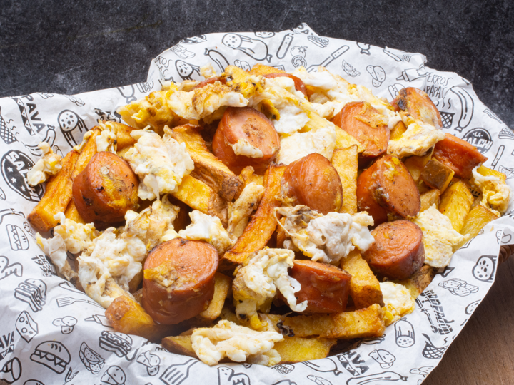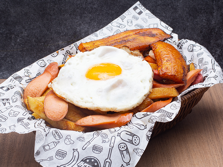 Original salchicha frankfurter en corte barril, huevo, plátano frito y nuestras sabrosas papas peruanas.