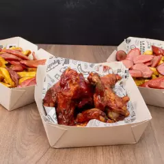2 Salchipapas junior de hot dog y 6 alitas en salsa BBQ.