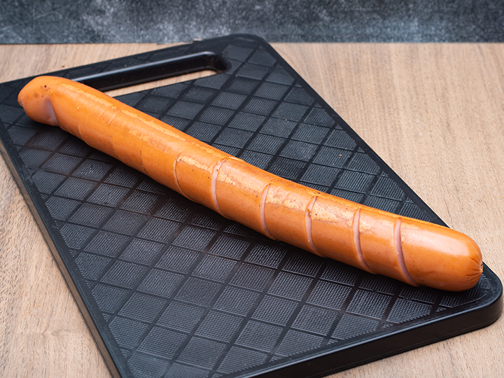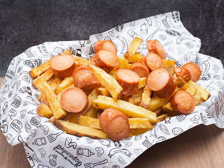 Original salchicha frankfurter en corte barril, acompañada de nuestras sabrosas papas peruanas.
