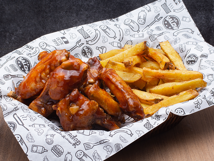 6 Deliciosas alitas de pollo en salsa BBQ y nuestras sabrosas papas peruanas.
