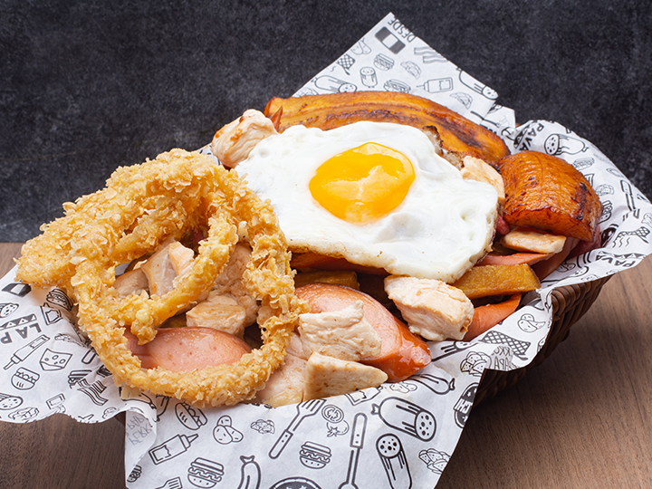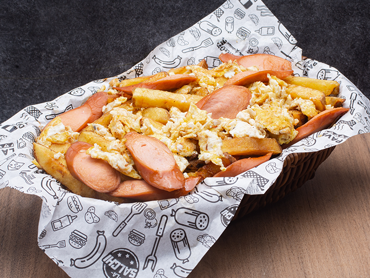 De las más contundentes, original salchicha frankfurter, chorizo parrillero, chorizo de finas hierbas, pechuga de pollo en trozos, tocino, huevo y nuestras sabrosas papas peruanas.