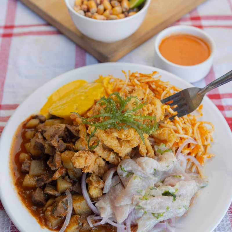 Contundente plato que lleva causa de atún, chicharrón de pescado, ceviche, arroz con mariscos.